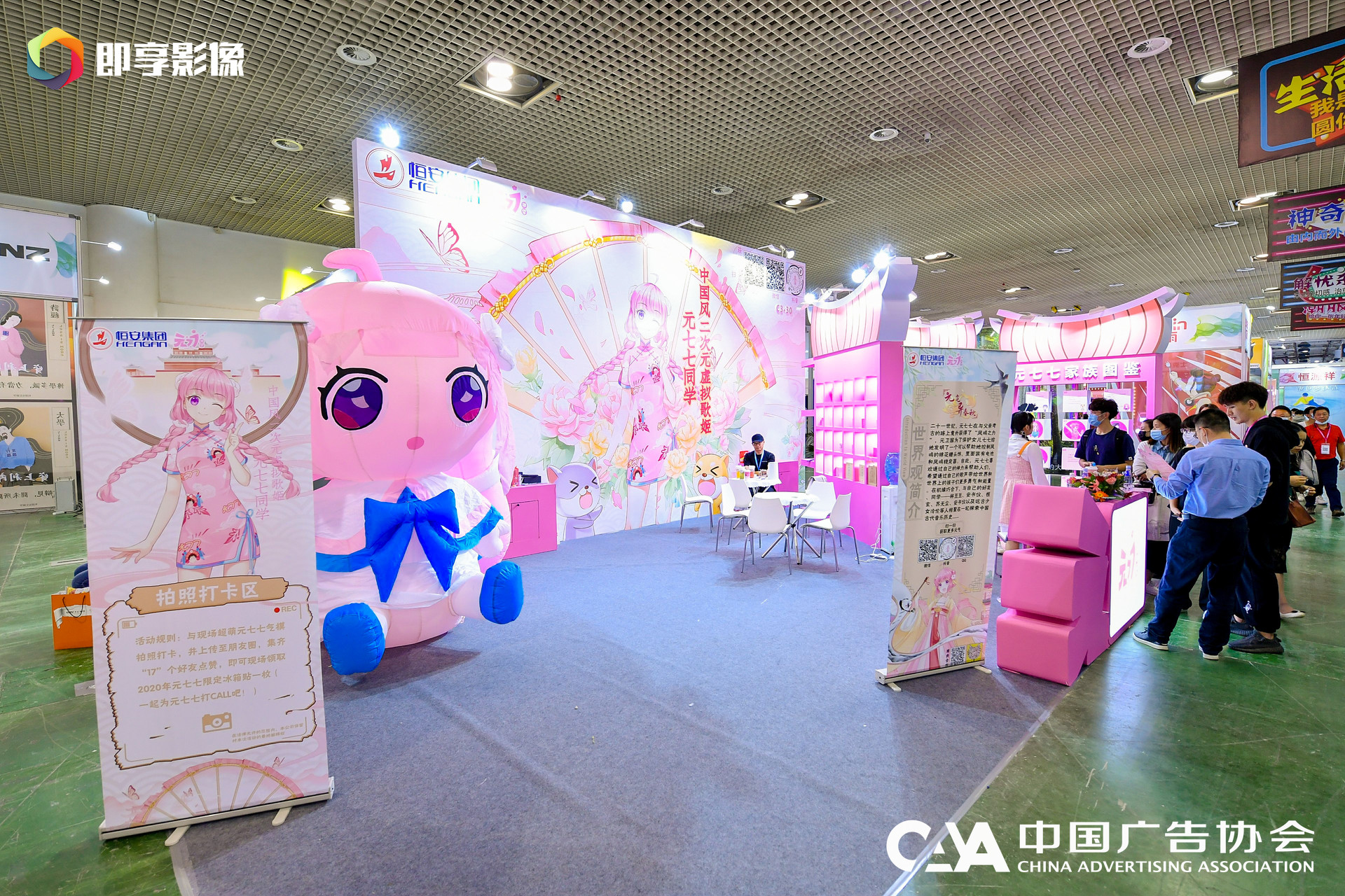 在元七七展区,超大玩偶元七七闪亮登场,作为中国风二次元虚拟歌姬,元七七及其衍生品吸引力众多粉丝驻足拍照,整个展区以粉色调为主,营造出兼具时尚与可爱的国风“少女感”。